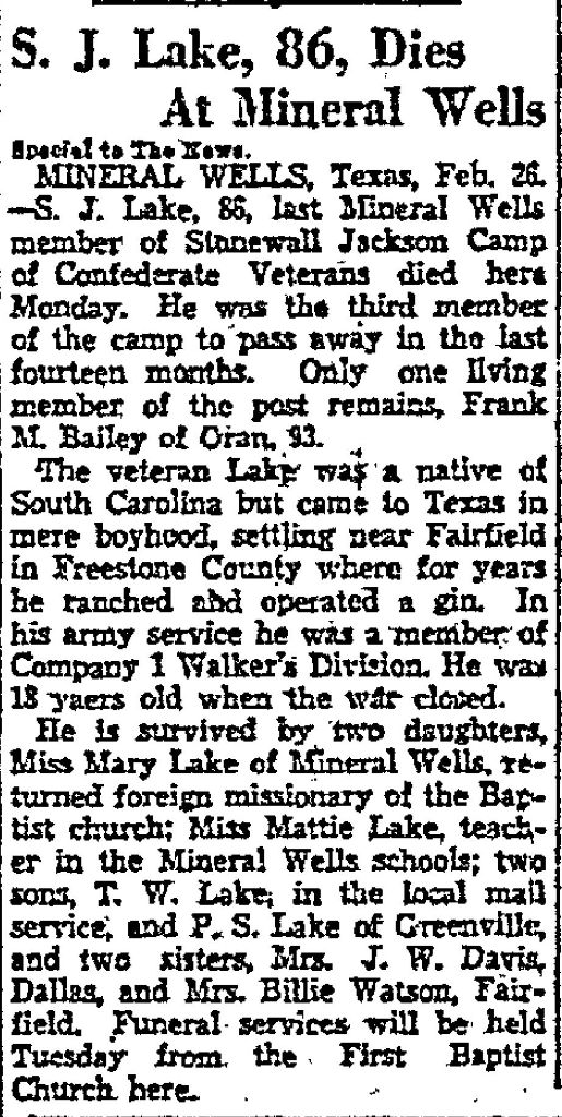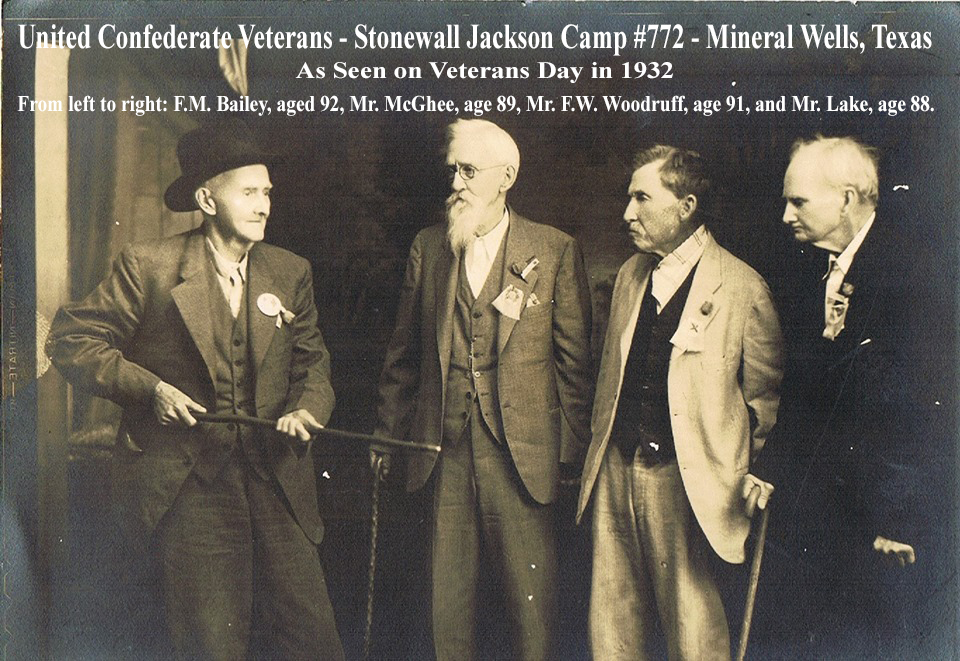 (photo above - Silas Lake on Veterans Day 1932 at a meeting of the United Confederate Veterans, Stonewall Jackson Camp in Mineral Wells, Texas.)